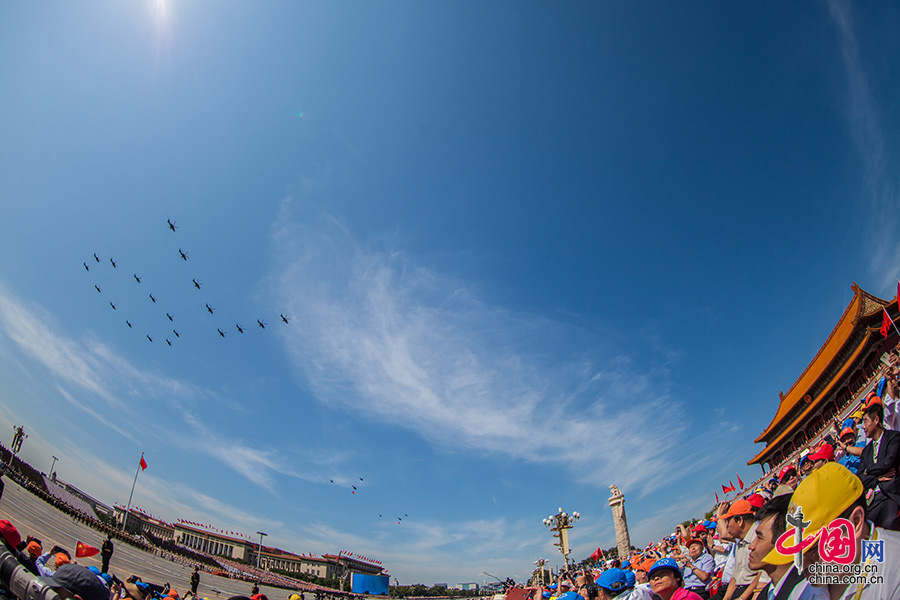 9月3日,中國人民抗日戰爭暨世界反法西斯戰爭勝利70周年紀念大會在北京隆重舉行。圖為空中護旗方隊接受檢閱。中國網記者 鄭亮 攝