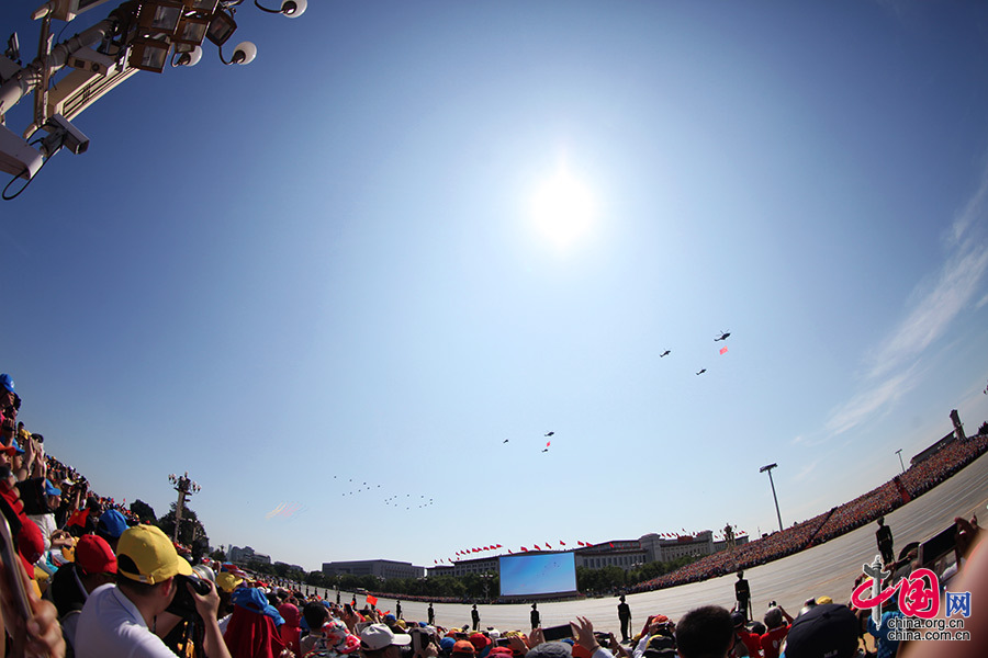 9月3日,中國人民抗日戰爭暨世界反法西斯戰爭勝利70周年紀念大會在北京隆重舉行。圖為空中護旗方隊接受檢閱。中國網記者 鄭亮 攝