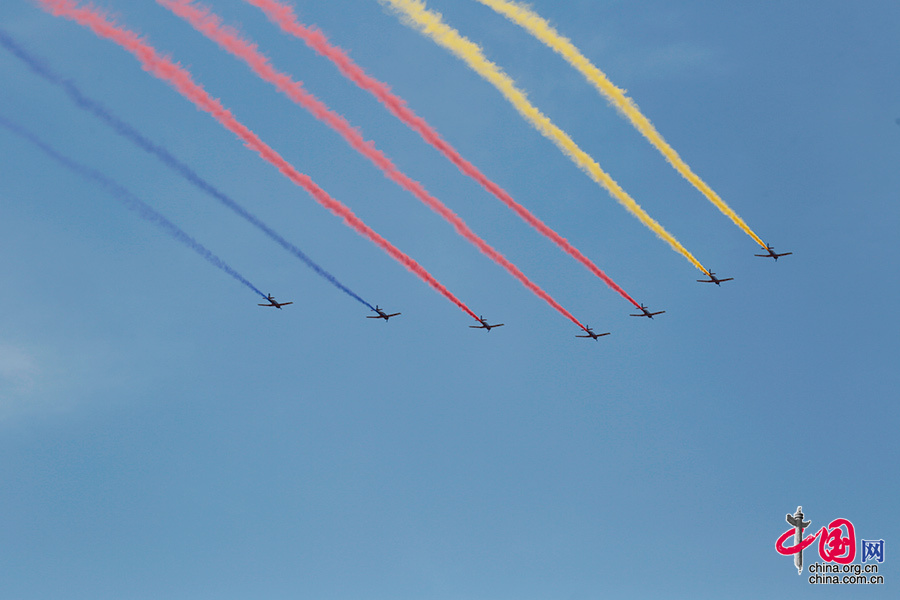 9月3日,紀念中國人民抗日戰爭暨世界反法西斯戰爭勝利70周年大會在北京天安門廣場隆重舉行。圖為空中護旗方隊。中國網記者 楊佳 攝