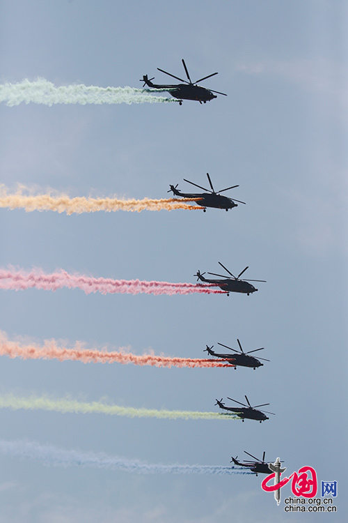 9月3日,中國人民抗日戰爭暨世界反法西斯戰爭勝利70周年紀念大會在北京隆重舉行。這是直升機梯隊接受檢閱。中國網記者 楊佳 攝