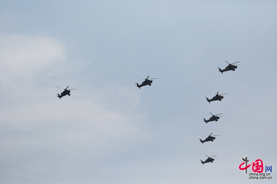 9月3日,中國人民抗日戰爭暨世界反法西斯戰爭勝利70周年紀念大會在北京隆重舉行。這是直升機梯隊接受檢閱。中國網記者 楊佳 攝