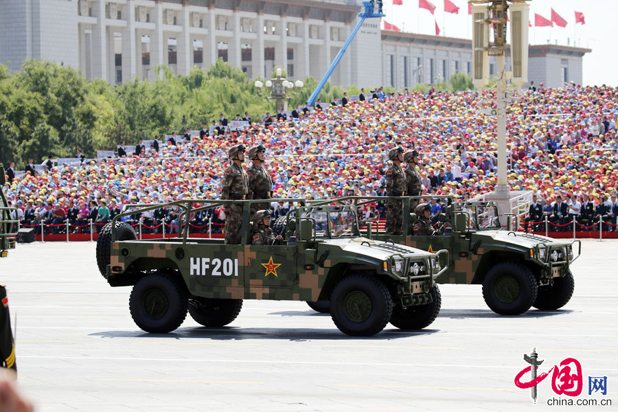 9月3日,中國人民抗日戰爭暨世界反法西斯戰爭勝利70周年紀念大會在北京隆重舉行。裝備保障方隊通過天安門廣場接受檢閱。中國網楊佳攝影