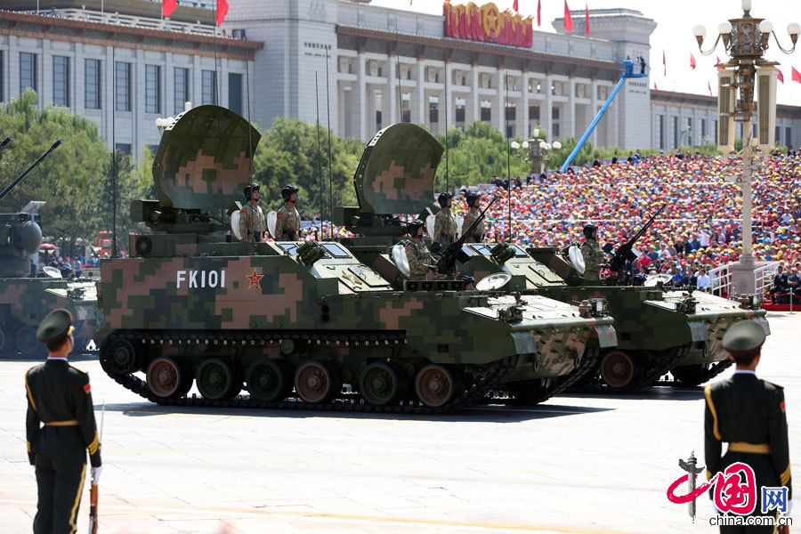 9月3日,中國人民抗日戰(zhàn)爭(zhēng)暨世界反法西斯戰(zhàn)爭(zhēng)勝利70周年紀(jì)念大會(huì)在北京隆重舉行。這是高射炮兵方隊(duì)接受檢閱。中國網(wǎng)楊佳攝影