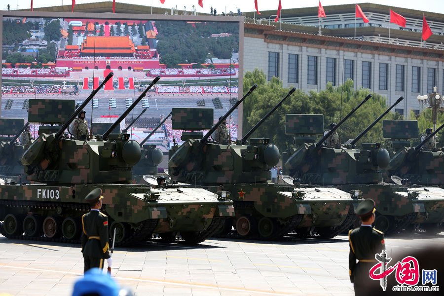 9月3日,中國人民抗日戰(zhàn)爭暨世界反法西斯戰(zhàn)爭勝利70周年紀念大會在北京隆重舉行。這是高射炮兵方隊接受檢閱。
