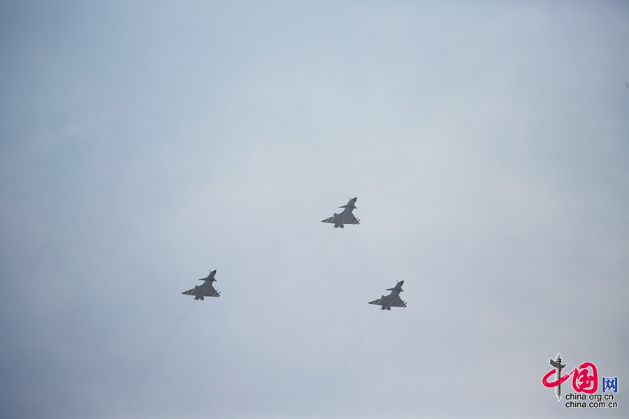 9月3日,中國人民抗日戰(zhàn)爭暨世界反法西斯戰(zhàn)爭勝利70周年紀念大會在北京隆重舉行。圖為殲擊機第二梯隊接受檢閱。中國網(wǎng)記者 楊佳 攝