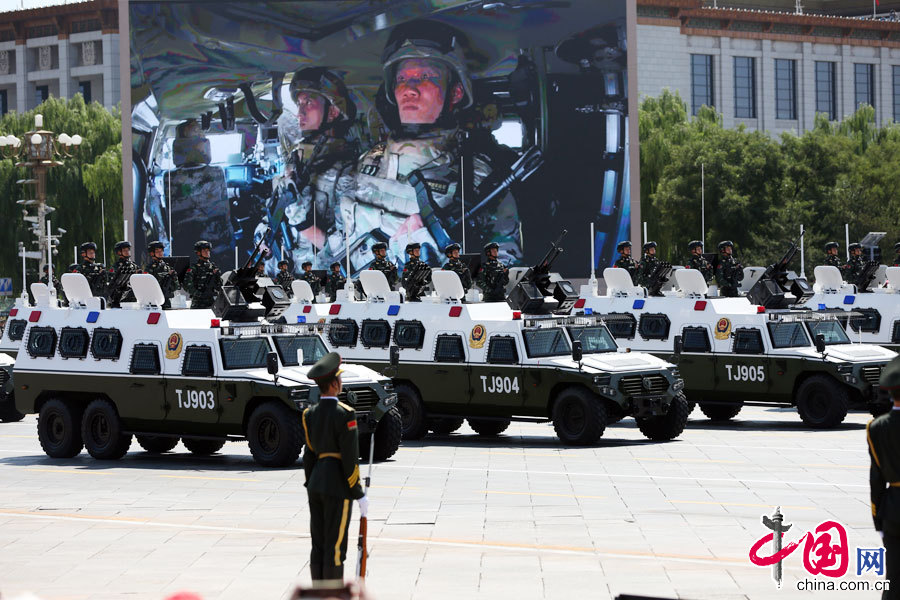 9月3日,中國人民抗日戰爭暨世界反法西斯戰爭勝利70周年紀念大會在北京隆重舉行。武警反恐突擊車方隊接受檢閱。