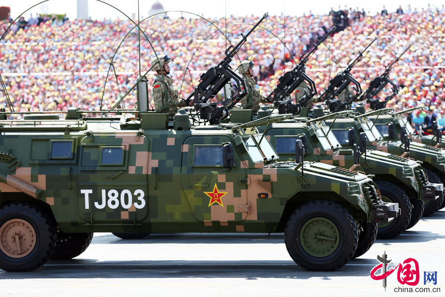 9月3日,中國人民抗日戰(zhàn)爭暨世界反法西斯戰(zhàn)爭勝利70周年紀(jì)念大會在北京隆重舉行。輕型突擊車方隊接受檢閱。