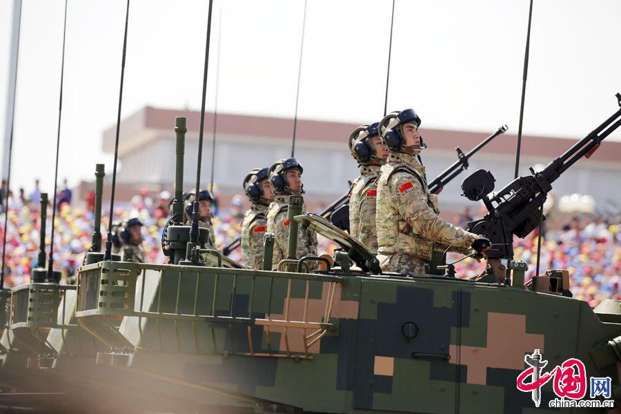 9月3日,中國人民抗日戰爭暨世界反法西斯戰爭勝利70周年紀念大會在北京隆重舉行。輪式裝甲突擊車方隊接受檢閱。