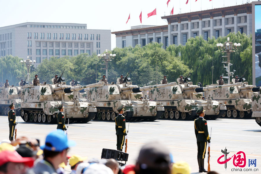 9月3日,中國人民抗日戰爭暨世界反法西斯戰爭勝利70周年紀念大會在北京隆重舉行。履帶自行火炮方隊接受檢閱。中國網鄭亮攝影