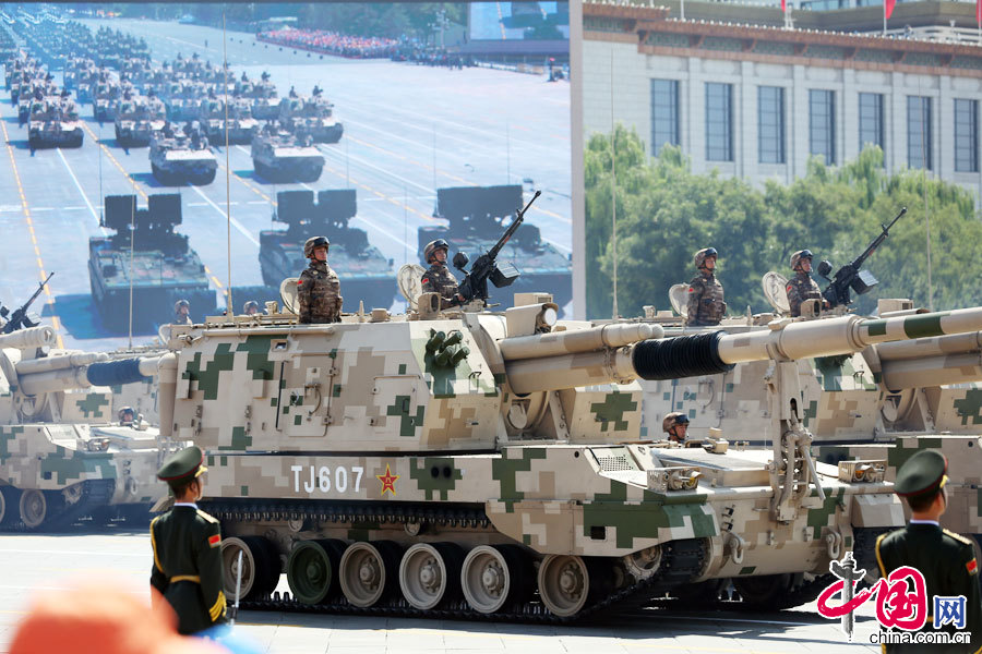 9月3日,中國人民抗日戰爭暨世界反法西斯戰爭勝利70周年紀念大會在北京隆重舉行。履帶自行火炮方隊接受檢閱。中國網鄭亮攝影